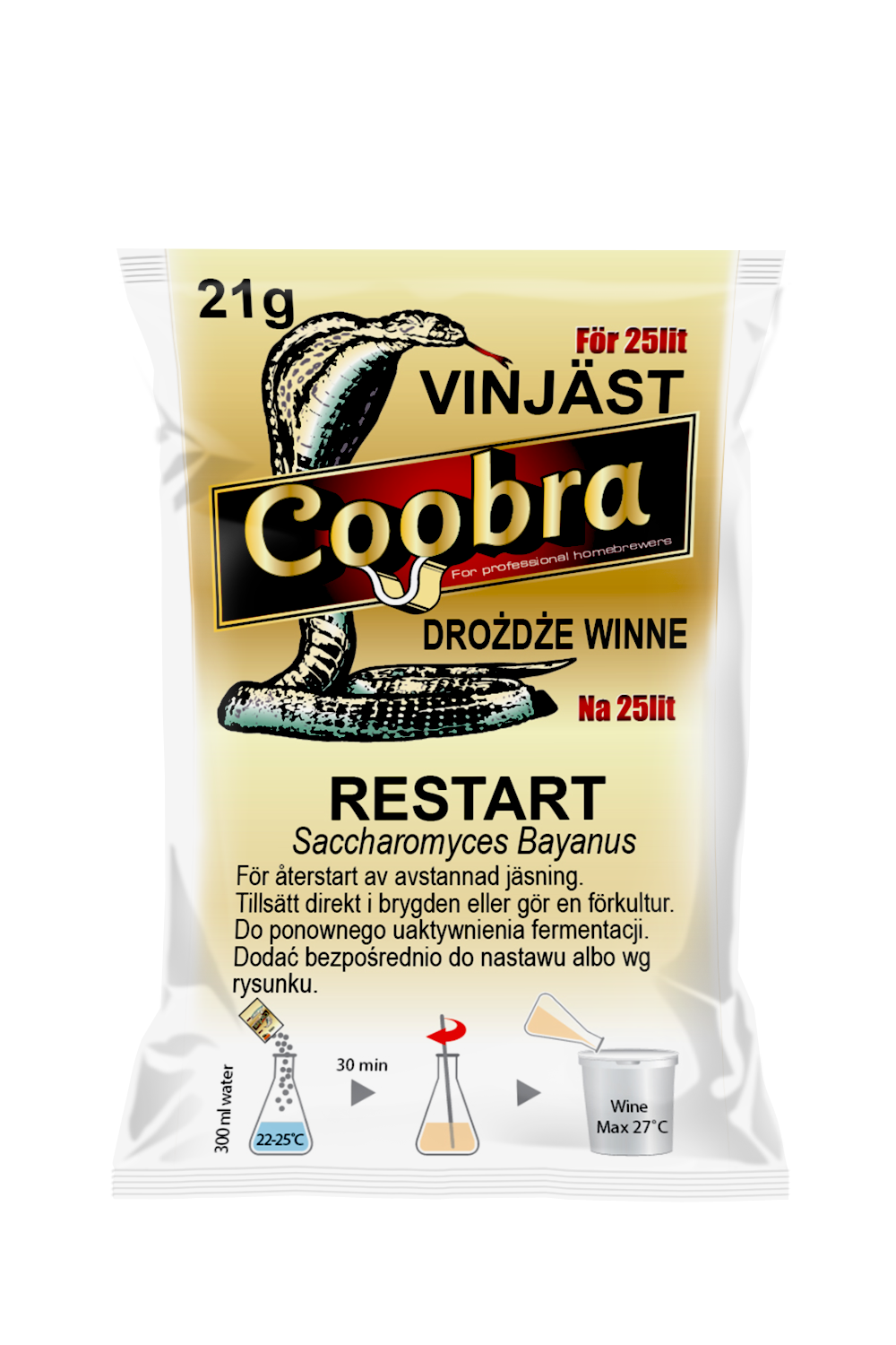 Coobra Restart to specjalnie wyselekcjonowane rasy drożdży o podwyższonej tolerancji na alkohol, przeznaczone do restartu win jak i innych nastawów w których stwierdziliśmy zatrzymanie fermentacji.