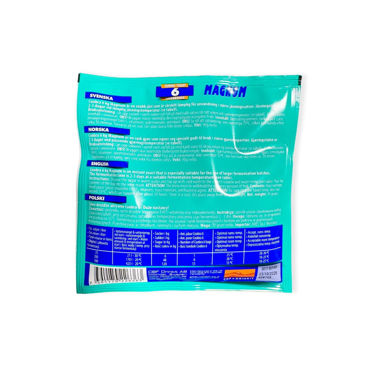 Drożdże COOBRA 6 – to specjalnie skomponowana mieszanka do fermentacji dużych łączonych nastawów nawet do 1000 litrów. Jej skład sprawia, że nastaw podczas fermentacji się nie przegrzewa co mogłoby spowodować obumieranie drożdży.