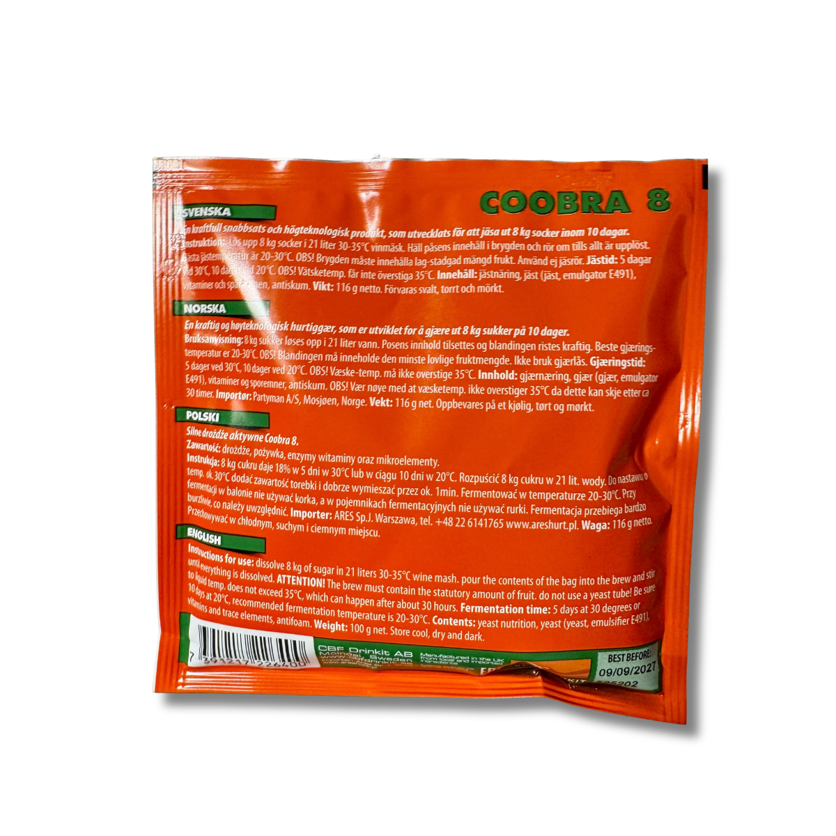 Drożdże COOBRA 8 – silna mieszanka najwyższej jakości drożdży gorzelniczych do szybkiej fermentacji 8kg cukru (lub 9kg glukozy) do 18%. Cukier należy rozpuścić w 21L ciepłej wody. Jak temperatura nastawu opadnie do 300C należy dodać całą zawartość saszetki z drożdżami i dobrze wymieszać. Optymalna temperatura fermentacji 250C.