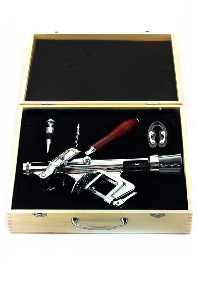 Korkociąg w pełni automatyczny – wystarczy jeden ruch dźwignią by wyciągnąć korek, solidnie mocowany do blatu za pomocą śruby, zapakowany w elegancką drewnianą skrzyneczkę, akcesoria dodatkowe: stalowa zatyczka do butelek, obcinacz do folii, zapasowa spirala.