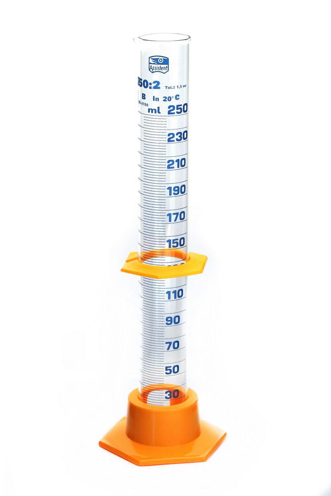 Menzurka szklana 250ml z podziałką, podstawką i ruchomym znacznikiem